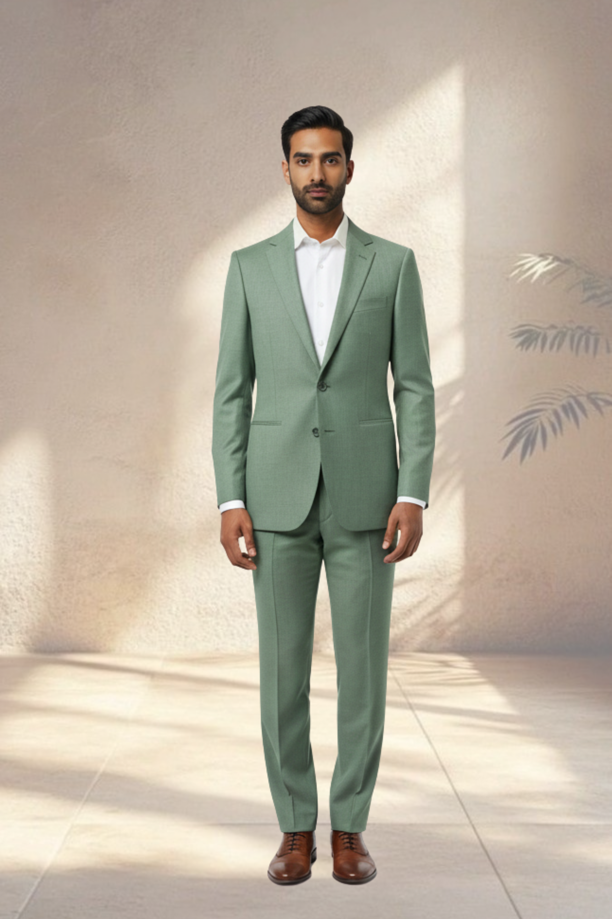 Fresh yet refined, this two-piece pista green suit brings a contemporary twist to classic tailoring. Crafted from premium worsted merino wool, it offers a smooth, breathable finish with just the right amount of structure. The soft green tone adds a touch of individuality while remaining versatile for weddings, formal gatherings, and summer occasions. Paired with a crisp white shirt and polished accessories, this suit delivers effortless sophistication with a modern edge.