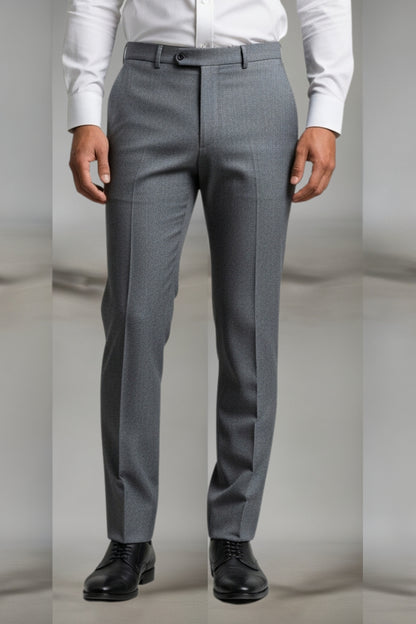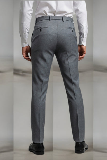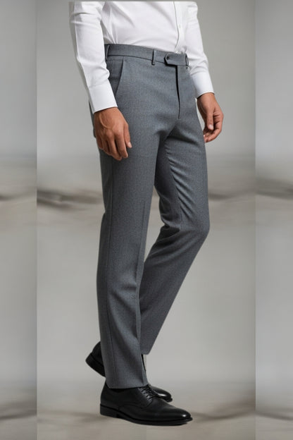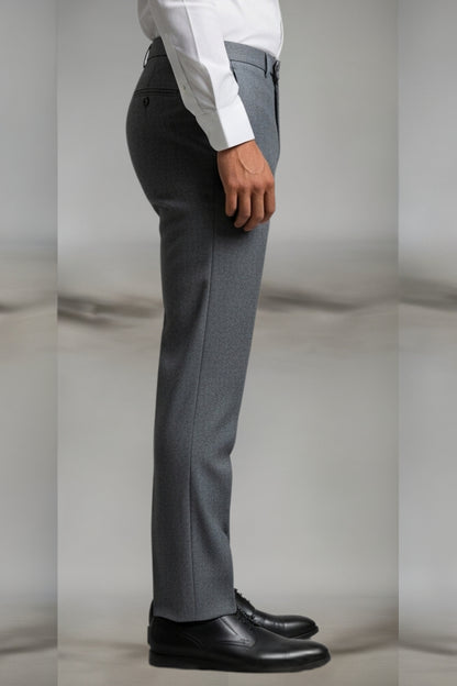 Elevate your everyday formalwear with these granite grey slim-fit trousers, tailored from a premium stretch wool-based fabric. The fine-textured weave and neatly pressed creases create a clean, structured silhouette — ideal for the modern professional.